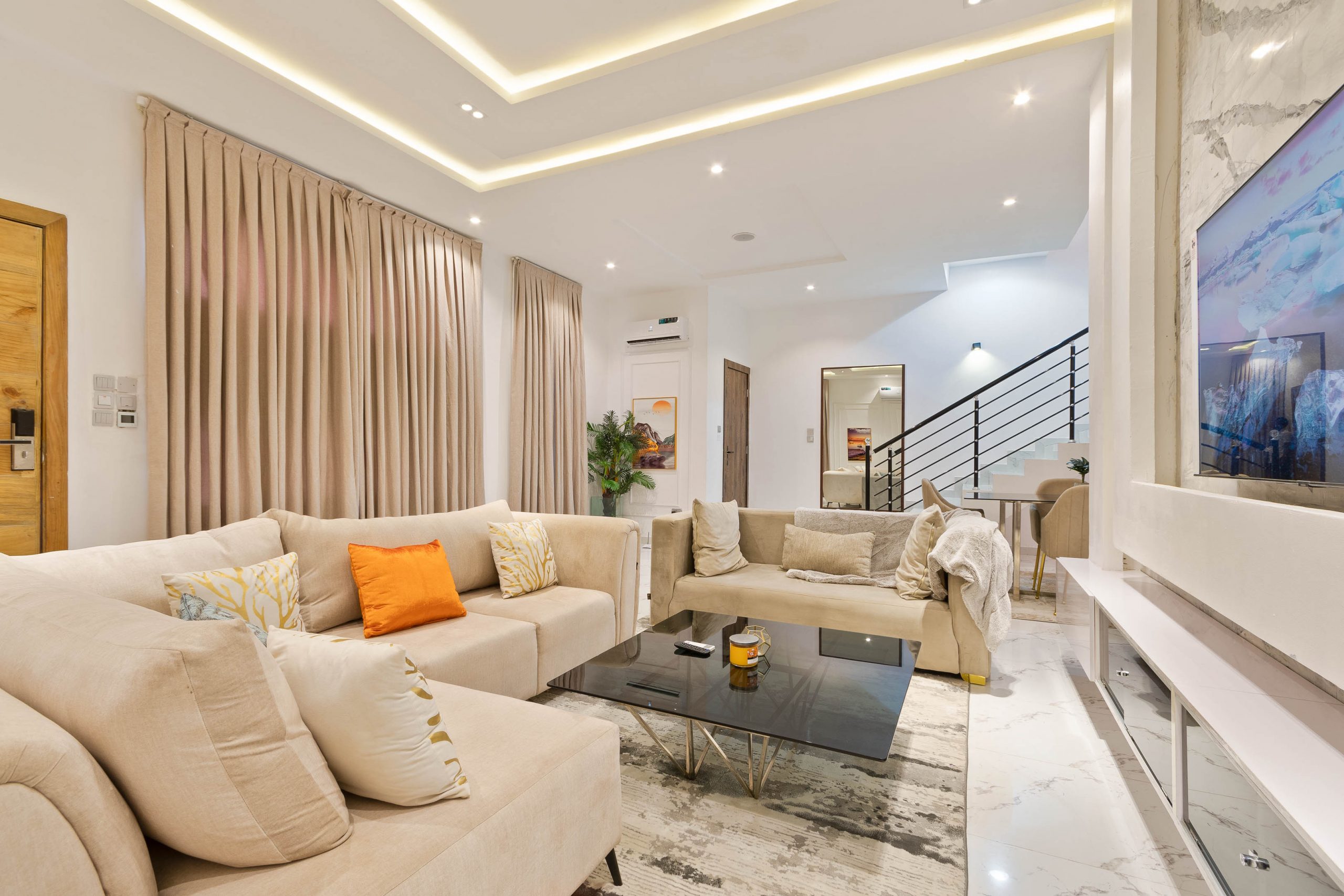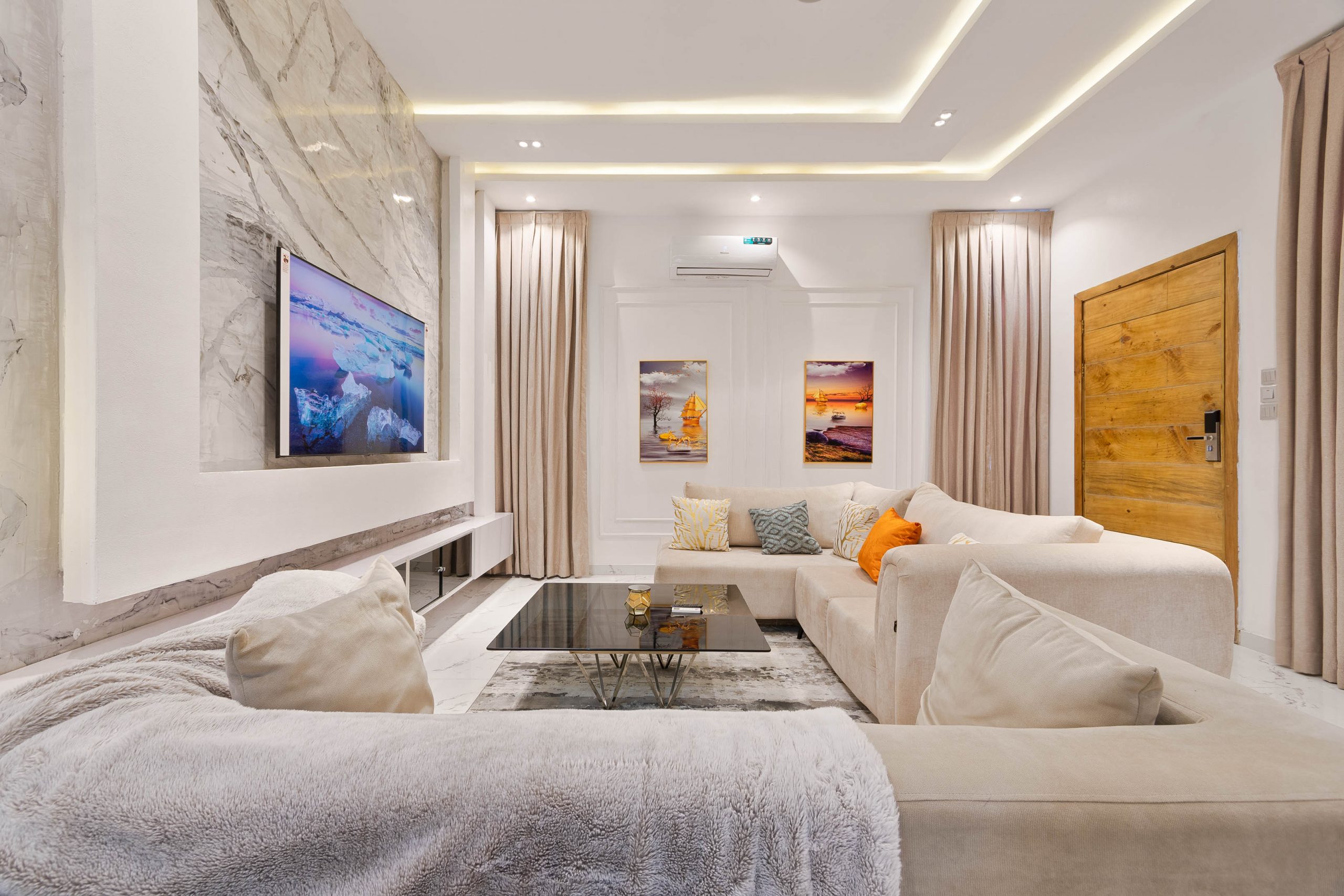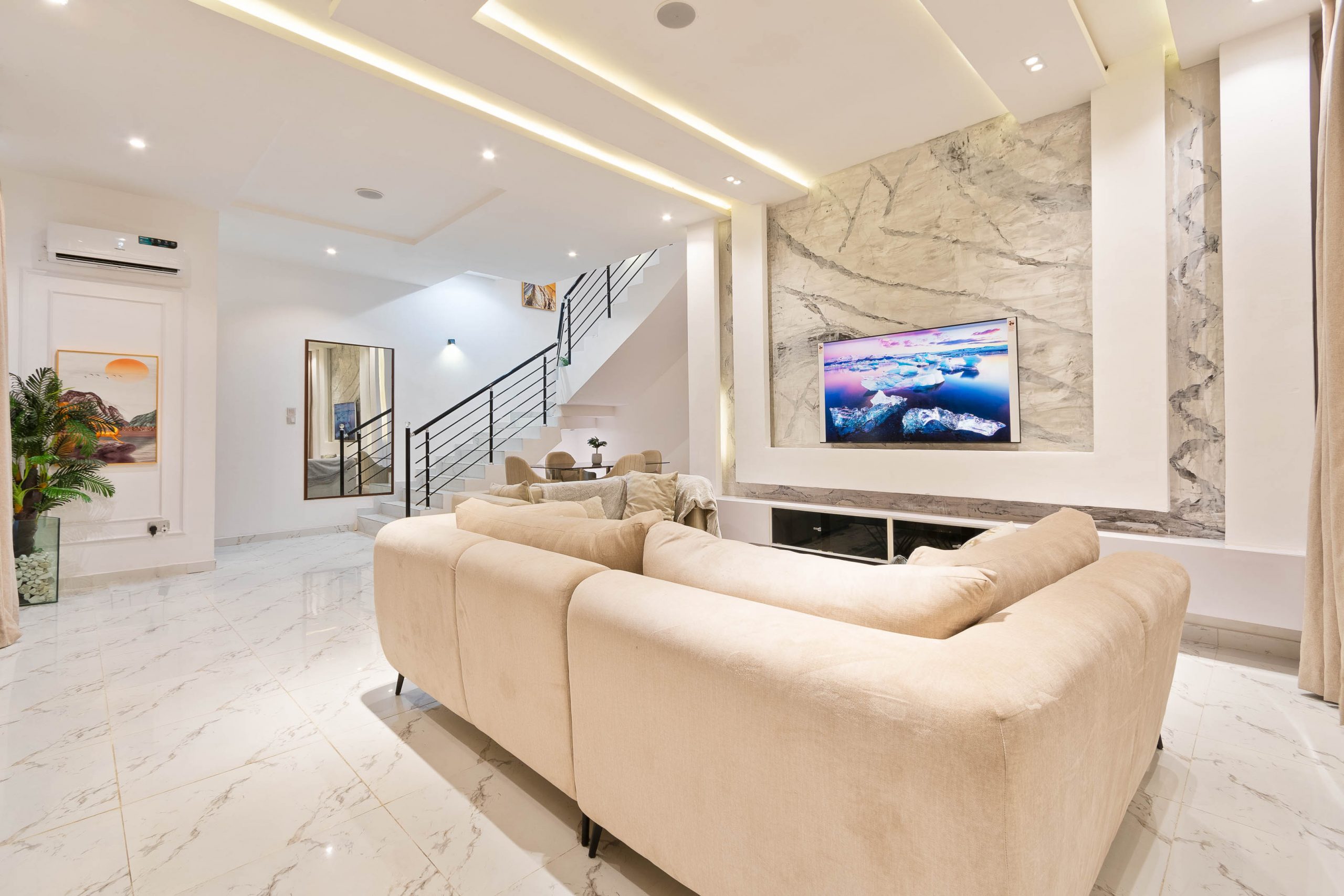 - Amenities: 24/7 Estate Security, 24/7 Power, 24/7 Private Security, Air Condition, Air Hockey Table, All rooms en-suite, Ample Parking Space, Automated Gate, Balcony, Central Water Heating System, Clean Water, Compact Plus DSTV, Family Lounge Area, Free Internet, Fully Fitted Kitchen with Utensils., Housekeeping, In-Built Speakers with Bluetooth & USB Ports., Luxury Dicon Optimum Orthopedic Mattresses., Luxury Furnishing & Lightings, Netflix, No Smoking/Party, Photo/Video Shoot Allowed based on review., Ping Pong / Table Tennis, Pool Table, Separate Laundry Room with Washing Machine and Dryer, Smart Home, Smart TV in all rooms, Swimming Pool, Walk-In Closet, Youtube